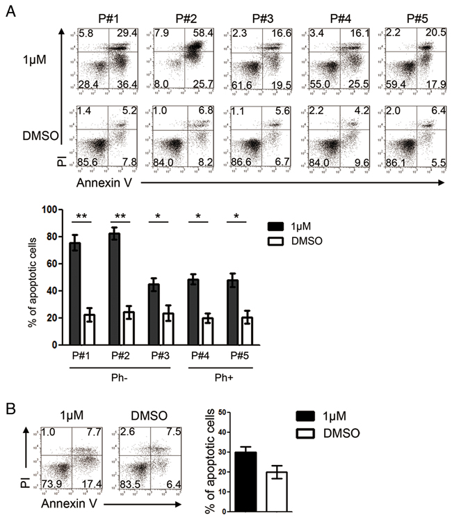 Figure 2: GZD824 induces apoptosis of primary pre-B ALL cells from patients with no toxicity to normal B cells. A. GZD824 cytotoxicity in primary pre-B ALL cells: primary pre-B ALL cells of P#1, P#2, and P#3 were from Ph- pre-B ALL, and primary pre-B ALL cells of P#4 and P#5 were from Ph+ pre-B ALL. Up: Representative flow cytometric analysis of primary pre-B ALL cells treated with DMSO or 1μM GZD824. Bottom: Statistical analysis of Annexin V-positive cells in GZD824 treated primary pre-B ALL cells. (P#1, P#2, P#3, P#4 and P#5 are short for patient #1, patient #2, patient #3, patient #4, and patient #5) B. Left: Representative flow cytometric analysis of normal B cells treated with DMSO or 1μM GZD824. Right: Statistical analysis of AnnexinV-positive cells in GZD824 treated primary B cells. Data are shown as the mean ± SEM (error bars) from three independent experiments. Significance values: *P<0.05; **P<0.01; ***P<0.001.