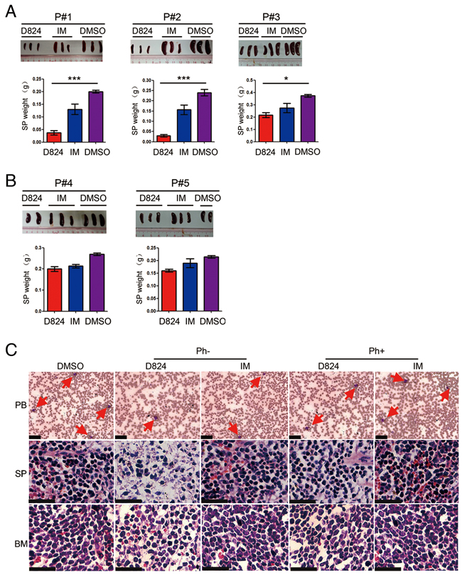 Figure 3: GZD824 inhibits the growth of pre-B ALL cells in PDX models. A. SP of the mice that were injected with pre-B ALL cells of P#1, P#2, and P#3 with GZD824, imatinib (IM), or DMSO treatment were compared for sizes and weights. Top: The pictures of SP sizes were compared in GZD824, IM, or DMSO group. Bottom: Statistical analysis of SP weight in GZD824, IM or DMSO group B. SP of the mice that were injected with pre-B ALL cells of P#4 and P#5 with GZD824, IM, or DMSO treatment were compared for sizes and weights. Top: The pictures of SP sizes were compared in GZD824, IM or DMSO group. Bottom: Statistical analysis of SP weight in GZD824, IM or DMSO group. C. PDX mice of P#2 with GZD824 treatment had reduced leukemic infiltration in PB, SP, and BM compared to the mice treated with IM or DMSO. Tissue sections of PB (top), SP (middle), and BM (bottom) were assessed histologically after Wright-Giemsa or H&E staining. Red arrows represent examples of leukemic blasts. Slides were imaged on an Olympus BX46 microscope with an Olympus DP72 camera at ×40 magnifications with 0.5 apertures; Olympus cellSens Standard 1.5 image acquisition software was used. Scale bar = 25 μm in all photomicrographs. Data are shown as the mean ± SEM (error bars) from three independent experiments. Significance values: *P<0.05; **P<0.01; ***P<0.001.