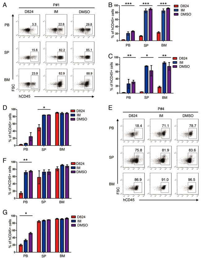 Figure 4: Effects of GZD824 on pre-B ALL cells engraftment. A. Representative flow cytometric analysis of human CD45+ cells in PB (top), SP (middle), and BM (bottom) of P#1-engrafted mice after treatment with GZD824, IM, or DMSO. B-D. The percentages of human CD45+ cells in the PB, SP, and BM of mice transplanted with pre-B ALL cells of P#1 (B), P#2 (C), and P#3 (D) treated under different conditions were measured when the mice were culled. E. Representative flow cytometric analysis of human CD45+ cells in PB (top), SP (middle), and BM (bottom) of P#4-engrafted mice after treatment with GZD824, IM, or DMSO. F-G. The percentages of human CD45+ cells in the PB, SP, and BM of mice transplanted with pre-B ALL cells of P#4 (F) or P#5 (G) treated under different conditions were measured when the mice were culled. Significance values: *P<0.05; **P<0.01; ***P<0.001.