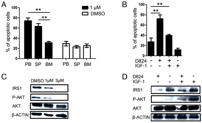 The percentages of residual pre-B ALL cells in PB, SP, and BM were different in individual PDX mice upon GZD824 treatment (Figure 4A–4G), suggesting that pre-B ALL cells in these compartments showed different resistance capacities to GZD824. Therefore, we compared the GZD824 sensitivity among the pre-B ALL cells harvested from the PB, SP, and BM of the same pre-B ALL PDX mice. Before in vitro assay, the pre-B ALL cells from different organs were purified with human anti-CD45+ by MACS (Supplementary Figure S3A-B). Interestingly, compared to the pre-B ALL cells derived from PB and SP, the percentages of apoptotic pre-B ALL cells derived from BM were significantly lower than those from SP and PB 24 hours after GZD824 treatment in vitro (Figure 6A), suggesting that the pre-B ALL cells from BM were more tolerant to GZD824 treatment. We previously found that insulin-like growth factor 1 (IGF-1), which is highly expressed in BM, increased the resistance capacity of pre-B ALL cells to chemotherapy via the PI3K/AKT pathway (Zhiwu Jang unpublished). Thus, we hypothesized that IGF-1 would rescue pre-B ALL cells from GZD824 inhibition by up-regulating the PI3K/AKT pathway. Primary pre-B ALL cells treated with GZD824 alone showed much higher apoptotic levels than those cells treated with both GZD824 and IGF-1 (Figure 6B), suggesting that IGF-1 decreased the sensitivity of pre-B ALL cells to GZD824 treatment.