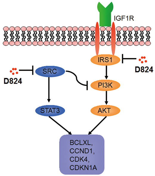 Ph– pre-B ALL cells were more sensitive to GZD824 than Ph+ pre-B ALL cells both in vitro and in vivo, suggesting that other mechanisms are involved in the action of GZD824 inhibition of pre-B ALL. Levels of both P-SRC and P-STAT3, a downstream phosphorylation target of SRC, were significantly reduced after treatment with GZD824 in Ph– pre-B ALL cells (Figure 7). GZD824 suppressed both SRC and PI3K/AKT in Ph– cells, which is consistent with other reports that inhibition of SRC kinase or PI3K/AKT signaling suppresses ALL cells in vitro and in vivo [11, 32–34]. To our knowledge, GZD824 is the first compound to show an antitumor effect in pre-B ALL by inhibiting both the SRC kinase and IRS1/PI3K/AKT pathways (Figure 7). IRS1 is an important mediator between IGF-1 receptors and the PI3K/AKT pathway [35, 36]. An earlier study suggested that IRS1 expression correlates negatively with survival in patients with Ph+ ALL [37]. In the present study, levels of IRS1 expression were negatively correlated with GZD824 treatment outcomes in xenografts (Supplementary Figure S4). Thus IRS1 could potentially be used as a biomarker to predict GZD824 efficiency in treating pre-B ALL in the future.