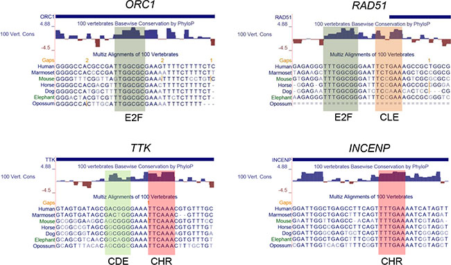 Figure 1: Early and late cell cycle genes exhibit specific evolutionary conserved single and tandem elements in their promoters. Potential regulatory elements of ORC1, RAD51, TTK, and INCENP were identified with the UCSC genome browser by aligning promoter sequences of seven mammalian species and by applying the 100 vertebrate conservation track [52].