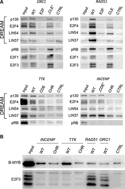 Figure 4: Different promoter elements in early and late cell cycle genes recruit MuvB components, pRB, or activating E2Fs in vitro. (A) DREAM components (p130, E2F4, LIN54, and LIN37) as well as pRB and activating E2Fs (E2F1, E2F3) were purified from nuclear extracts of serum-starved T98G cells by DNA affinity purification and detected by western blot. Binding to wild-type promoter probes (WT) was compared with binding to mutant probes (E2F, CLE, CDE, and CHR). “CDE” and “CLE” represent non-functional elements. Background protein binding was determined with a probe of the Gapdhs promoter (CTRL). (B) Binding of the MMB components B-MYB and the activating E2F3 was analyzed by DNA affinity purification with nuclear extracts from proliferating T98G cells.