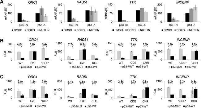 Figure 5: p53-dependent repression of early and late cell cycle genes depends on single or tandem elements and can function in pRB negative cells. (A) p53-positive (p53+/+) or negative (p53−/−) HCT116 cells were treated for 24 h with doxorubicin (DOXO) or Nutlin-3 (NUTLIN) or DMSO. mRNA expression was determined by qPCR. Results were normalized to samples treated with DMSO (100%). (B) p53-negative HCT116 cells or (C) p53/pRB-negative SaOS-2 cells were transfected with wild-type (WT) and mutant (CDE, CHR, E2F, CLE) promoter reporter constructs together with expression plasmids for p53 wild-type (p53-WT) or a DNA binding-deficient mutant (p53-MUT). 48 h after transfection promoter reporter activities were analyzed by luciferase assays and are given as relative light units (RLU).