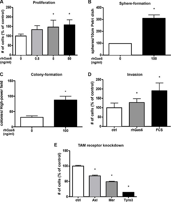 Migration and Invasion assays were performed using a transwell method (ThinCert – 24 well; pore size 8 μm; greiner-bio one), with Matrigel™ Basement Membrane Matrix (Becton Dickinson) coated membranes for invasion assays. 10.000 colorectal cancer cells (HCT116)/well were seeded in serum-free medium and migration/invasion was enabled for 24 hours. Recombinant human Gas6 (100 ng/ml; R&D Systems) and 20% FCS supplemented medium worked as chemoattractants whereas FCS was used as a positive control. Migrated cells were stained with a Crystal violet solution. Subsequently staining was extracted from the cells by 10% acetic acid and absorption of the extracted solution was measured using an ELISA-Reader at 540 nm (TECAN).
