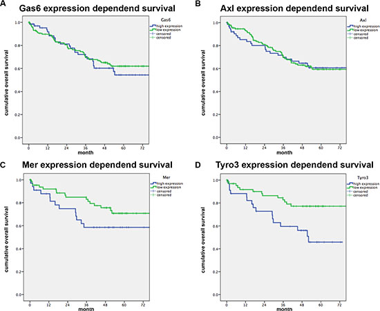 The role of Gas6/TAM receptors in solid tumors is still not completely elucidated. Gas6 expression was shown in tumor cells of gastric cancer, ovarian cancer and glioblastoma multiforme (GBM) [13–15], unlike renal cell carcinoma and breast cancer [16–18]. Furthermore Gas6 may also be expressed in tumor-associated cells like macrophages [19], which we have previously shown in animal models [20]. Although Gas6 expression was shown to be usually higher in tumor tissue, a correlation to survival was not confirmed throughout different tumor entities [6]. The Axl receptor is similarly overexpressed within the tumor tissue of different cancers (i.e. breast cancer, renal cell carcinoma, GBM, ovarian cancer, pancreatic cancer and esophageal cancer), and high Axl expression was associated with a shorter survival and more advanced tumor stage [6].