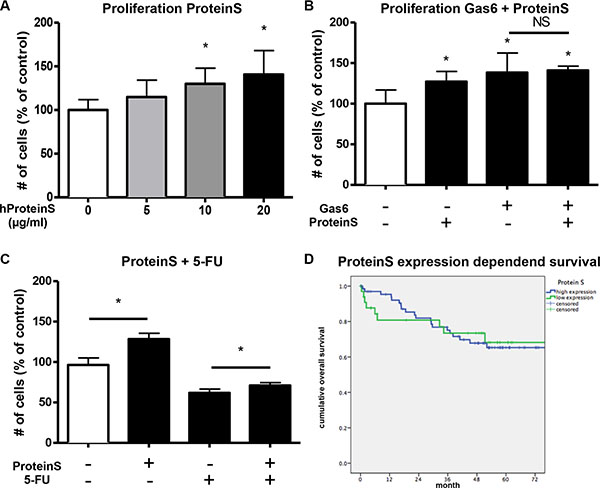 Figure 7: ProteinS increases proliferation and chemoresistance in vitro. (A) Human ProteinS (hProteinS) dose-dependently induces proliferation of human colorectal cancer cells (HCT116) in vitro after 48 hours treatment (n = 6; P < .05). (B) Simultaneous stimulation of human colorectal cancer cells (HCT116) with recombinant human Gas6 (100 ng/ml) and human ProteinS (20 μg/ml) in vitro with no additive proliferative effect of both mitogens together (n = 6; P < .05). (C) Simultaneous treatment of human colorectal cancer cells (HCT116) with human ProteinS (20 μg/ml) and 5-Fluorouracil (5 μM) in vitro. The antiproliferative effect of 5-Fluorouracil was partially antagonized by Protein S (n = 6; P < .05). (D) RT-PCR analysis was performed for ProteinS in colorectal tumor samples and normal mucosa of the patients. No difference in Kaplan-Maier analyses of overall survival in patients with high (blue) or low (green) expression within the tumor. Relative ProteinS mRNA expression is not associated with patients survival (n = 103; P = NS).