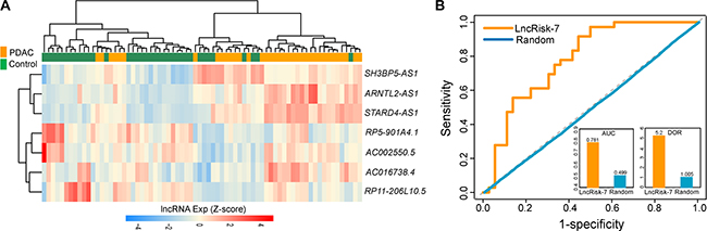 Figure 4: Independent validation of the LncRisk-7 for early diagnosis in another cohort of 52 samples from Pei’s study. (A) Hierarchical clustering heatmap and dendrogram of 52 samples based expression patterns of 7 lncRNA biomarkers. (B) The discriminatory performance of the LncRisk-7, evaluated by ROC analysis and calculating the AUC and DOR.