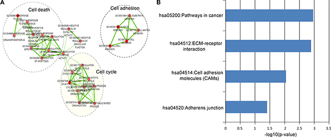 Figure 6: Functional analysis of the diagnostic lncRNAs. (A) The functional enrichment map of GO terms for mRNAs as ceRNA counterparts of lncRNA biomarkers. Each node represents a GO term and an edge represents the proportion of shared genes between connecting GO terms. (B) The enriched KEGG pathways ranked by –log10 (p-value).