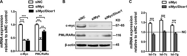 Figure 1: Repression of PML/RARα by c-Myc is miRNA dependent. (A) QRT-PCR analysis of c-myc and PML/RARα mRNA changes at 24 hr following siRNA mediated silencing of c-myc with and without siRNA-mediated silencing of Dicer1. The data were normalized to nontarget siRNA (siNC) transfection. (B) Western blot showing c-myc and PML/RARα protein expression 48 h after transfection of the indicated siRNAs. (C) MicroRNA RT-PCR showing expression of let-7a, 7c and 7g in response to siRNA against c-myc alone or together with siRNA against Dicer1. siNC was used as a control. Bar graph was represented as mean ± SD of three independent experiments performed in triplicates (n = 3). ** indicated P < 0.01 and *** indicated P < 0.001. Representative blot was shown from three independent experiments.