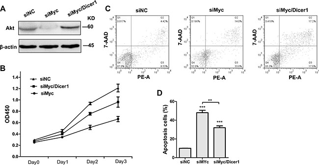Figure 2: Depletion of Dicer1 abrogated the effect of c-Myc silencing in NB4 cells. (A) Western blot of total AKT 48 h after the transfection with siRNAs agaist c-myc alone (siMyc) and together with siRNA against Dicer1 (siMyc/Dicer1). (B) Cell proliferation curve of NB4 cells transfected with the indicated siRNAs (n = 3, p < 0.05). (C) Apoptosis of NB4 cells treated with siNC, siMyc and siMyc/Dicer1 for 72 h as assessed by flow cytometry. PE-A on X-axis stands for PE-Annexin V. (D) Quantification of apoptosis cells shown in (C). Representative blot was shown from three independent experiments. Bar graph was represented as mean ± SD of three independent experiments performed in triplicates (n = 3). ** indicated P < 0.01 and *** indicated P < 0.001.