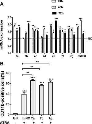 Figure 3: Let-7 miRNAs promoted granulocytic differentiation of NB4 cells. (A) RNA levels of indicated let-7 family members in NB4 cells treated with ATRA for 24, 48 and 72 h respectively, values were compared with DMSO-treated control cells (NC) in corresponding times. (B) CD11b expression assessed by flow cytometry in ATRA-treated cells (12 h after transfection) at 48 hr following ectopic expression of indicated let-7 miRNAs. Data were represented as mean ± SD of three independent experiments in triplicates (n = 3). * indicated P < 0.05, ** indicated P < 0.01 and *** indicated P < 0.001.