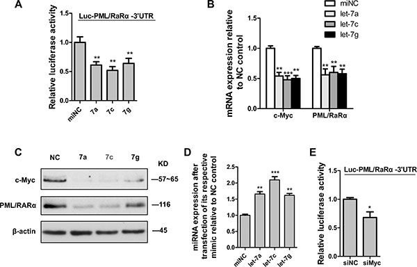 Figure 4: C-Myc suppressed PML/RARα by let-7 miRNAs via 3′UTR. (A) Luciferase activity in HEK293T cells cotransfected with PML/RARα3’UTR reporter construct and let-7 mimics (7a, 7c and 7g respectively) or scrambled microRNA control (miNC). (B) QRT-PCR analysis of c-myc and PML/RARα expression 48 hr after transfection of NB4 cells with let-7 mimics (let-7a, 7c and 7g respectively) and scrambled microRNA control (miNC). (C) Western blot analysis for c-myc and PML/RARα 48 hr after transfection of indicated mimics. (D) Efficiency of indicated let-7 ectopic expression, measured by qRT-PCR analysis. (E) Luciferase activity in HEK293T cells cotransfected with PML/RARα3′UTR reporter construct and siRNA against c-myc or nontarget control (siNC). Bar graph was represented as mean ± SD of three independent experiments performed in triplicates (n = 3). * indicated P < 0.05, ** indicated P < 0.01 and *** indicated P < 0.001. Representative blot was shown from three independent experiments.
