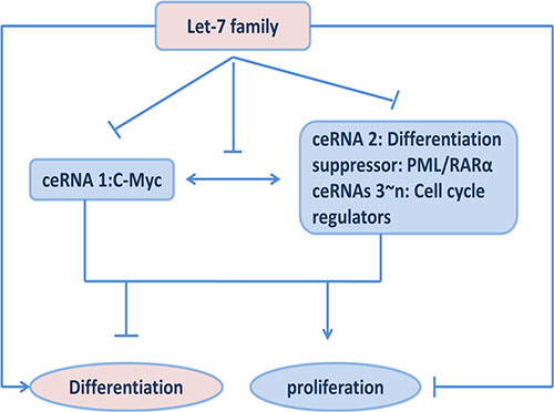 Figure 5: Effects of ceRNA functions among c-My, PML/RARα and let-7 miRNAs on cell proliferation and differentiation.