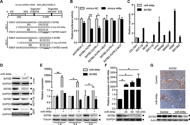 Figure 3: SATB2 is a direct target of miR-449a. (A) The predicted binding sites of miR-449a in the SATB2 3′UTR. (B) Luciferase activity of the SATB2 3′UTR reporter in 293T cells transfected with 100 nmol/L miR-NC or miR-449a mimics, 200 ng of the psiCHECK-SATB2 3′UTR reporter plasmid, SATB2-3′UTR-1 (binding site 1), SATB2-3′UTR-1-MUT (binding site 1 mutant), SATB2-3′UTR-2 (binding site 2), SATB2-3′UTR-2-MUT (binding site 2 mutant) or the control reporter plasmid for 24 hours. (C) miR-449a, SATB2 mRNA expression levels in different CRC cell lines using the CCD-112CoN cell line as the control. (D) SATB2 protein levels in Lovo, HT29, HCT116 and 293T cells treated with 100 nmol/L miR-NC or miR-449a mimics. (E) Effect of time-dependent inhibition of miR-449a mimics (upper panels) on the SATB2 protein (lower panels) in HCT116 cells. (F) Effect of dose-dependent inhibition of miR-449a mimics (upper panels) on the SATB2 protein (lower panels) in HCT116 cells. (G) Immunohistochemistry results (upper panels) and western blotting results for SATB2 in xenograft tumors derived from HCT116 cells stably expressing miR-449a or the negative control.