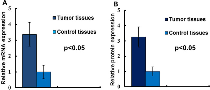 Figure 1: The LAPTM4B-35 expression in NSCLC. A. LAPTM4B-35 mRNA expressions in NSCLC tissues and adjacent normal tissues. The results of the real-time qRT-PCR were analyzed by using the 2-ΔΔCtmethod. B. The relative protein expression.