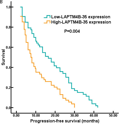 Figure 2: The survival curves of NSCLC patients with LAPTM4B-35 protein expression. A. The 5 year median OS was shorter in patients with high-LAPTM4B-35 protein expression compared to those patients with low-LAPTM4B-35 protein expression (p = 0.034). B. The 5 year median PFS was statistically shorter in the high LAPTM4B-35 protein expression group than low LAPTM4B-35 protein expression group (p = 0.004).