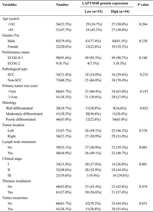 Table 1: Clinicopathological characteristics with LAPTM4B protein expression in NSCLC(n = 107)