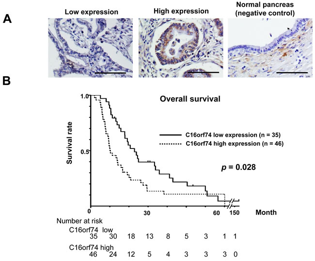 Correlation between C16orf74 expression pattern and PDAC patient prognosis