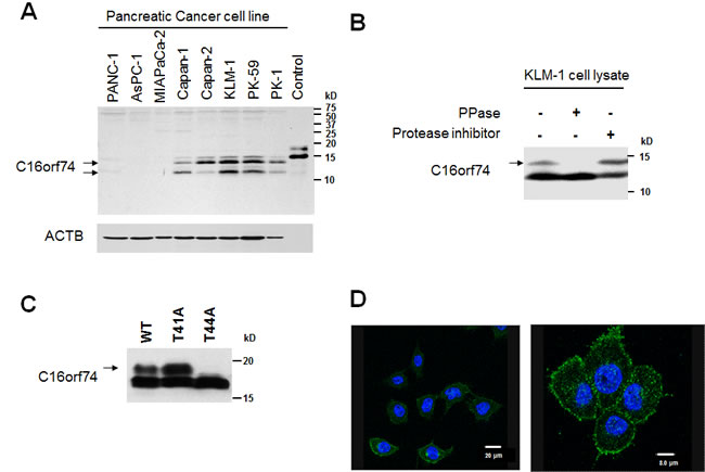 Figure 2: Protein expression, modification, and localization of C16orf74 in pancreatic cancer cells. A. Western blot analysis of the expression levels of C16orf74 in pancreatic cancer cell lines. Control: Flag-tagged C16orf74-overexpressed diluted cell lysate. B. Phosphorylated form (arrow) of endogenous C16orf74 in KLM-1 cells, as examined by Western blot analysis using an anti-C16orf74 polyclonal antibody. The upper band disappeared when the cell lysate was incubated with lambda phosphatase (PPase (+)). C. Phosphorylation at threonine 44 (T44) of C16orf74. Flag-tagged wild type (WT), T41A and T44A mutants of C16orf74 were used to transfect COS-7 cells. The phosphorylated form of wild-type C16orf74 (arrow) was disappeared in the T44A mutant. D. Immunocytochemical analysis in a pancreatic cancer cell line (PK-1) using the anti-C16orf74 antibody, demonstrating the plasma membrane localization of endogenous C16orf74 (Green). DAPI staining is shown in blue.