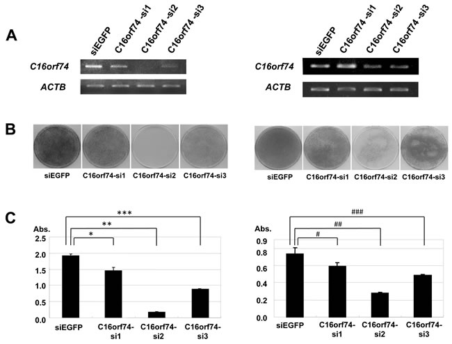 To knockdown the gene expression of C16orf74 in PDAC cells, we used a psiU6BX3.0 vector to express a short-hairpin RNA against the target gene, as described previously [40]. The target sequences for C16orf74 were 5V- CGACAAGCACCTGGACGTG-3V(C16orf74-si1), 5V- ATGTGTGTCAGCAGCAGCA-3V (C16orf74-si2), 5V- GTTGTTTTACAGATACGGA-3V (C16orf74-si3), and 5V-GAAGCAGCACGACTTCTTC-3V (for siEGFP as a negative control). The human PDAC cell lines KLM-1 (5x105 cells per dish) and PK-59 (2x105 cells per dish) were plated on 10-cm dishes and transfected with psiU6BX vectors including the target sequences for EGFP and C16orf74 using Nucleofector (Amaxa Biosystems, Cologne, Germany) according to the manufacturer’s protocol. Cells were selected in medium containing 500 µg/mL G418 for 7 days and then harvested to analyze the effect of knockdown on C16orf74 expression. The primers for these RT-PCR experiments were the same as those described above. For the colony formation assay, transfectants expressing siRNA were grown for 7 days in media containing G418. After fixation in 4% paraformaldehyde, the transfected cells were stained with Giemsa solution to assess colony formation. Cell viability was quantified using cell counting kit-8 (Dojindo, Kumamoto, Japan).
