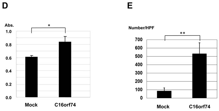 In this study, we have focused on C16orf74 (NM_206967.2), which is frequently over-expressed in PDACs but exhibits a restricted expression pattern in normal adult tissues. C16orf74 is a functionally unknown gene and was identified as Homo sapiens chromosome 16 open reading frame 74. C16orf74 has been reported as part of gene expression profiles such as the inflammation-associated gene profile [9] and several cancer prognosis-associated gene profiles [10, 12-15]. mRNA expression of C16orf74 has been reported as a factor for good prognosis in bladder cancer but controversially it was suggested to be associated with lymph node metastasis in tongue cancer [12, 15].