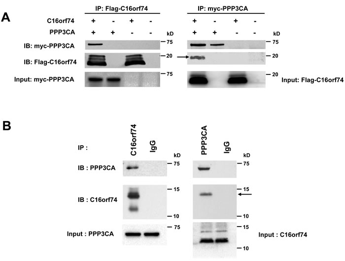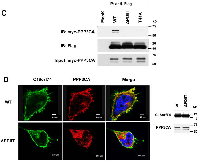 The cultured cells were washed twice with PBS and harvested in lysis buffer (150 mM NaCl, 1% Triton X-100, 50 mM Tris-HCl pH 7.4, 1 mM DTT, and 1X complete Protease Inhibitor Cocktail (Boehringer)). After the cells were homogenized and centrifuged at 10,000xg for 30 min, the protein concentration of the supernatant was standardized by the Bradford assay (Bio-Rad). Proteins were separated by 12% SDS-PAGE and immunoblotted with antibody. The antibodies used in the western blot analysis were rat anti-HA, mouse anti-HA (sc-7392, Santa Cruz), anti-Flag-M2, rabbit anti-Flag (F7425, SIGMA), mouse anti-beta-actin (A5441, SIGMA), mouse anti-PPP3CA (sc-17808, Santa Cruz), and rabbit anti- C16orf74 antibodies.