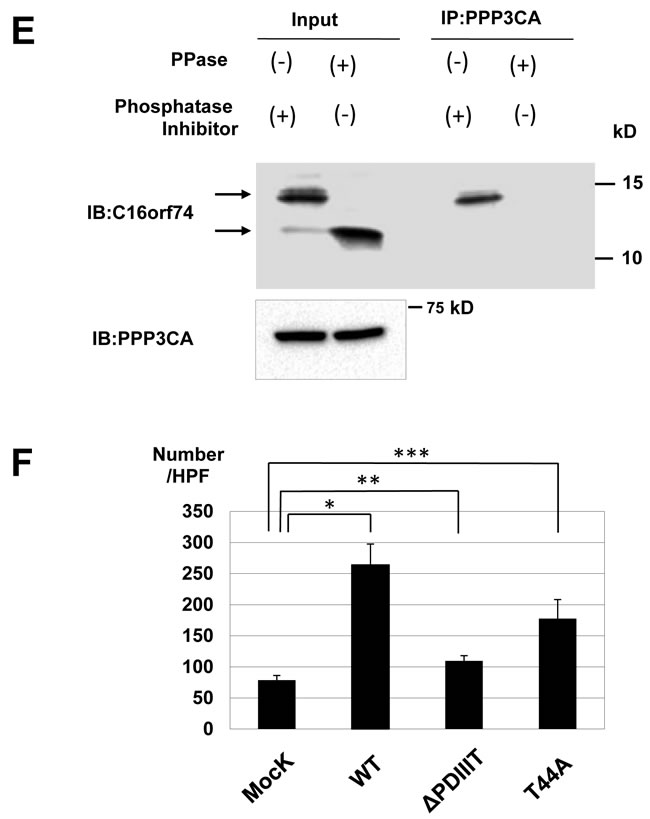 Figure 5: Interaction between C16orf74 and PPP3CA. A. In vitro exogenous association of C16orf74 and PPP3CA. The Flag-tagged C16orf74 construct or vector alone was cotransfected with a myc-tagged PPP3CA construct into HEK293 cells. Cell lysates were immunoprecipitated using mouse anti-Flag antibody (left) or anti-myc antibody (right). Immunoblotting of the immunoprecipitates with rabbit anti-Flag or anti-myc antibodies revealed a specific interaction between the phosphorylated form of C16orf74 (arrow) and PPP3CA. B. In vitro endogenous association of C16orf74 and PPP3CA from Capan-1 pancreatic cancer cells, which endogenously express high levels of both C16orf74 and PPP3CA. Capan-1 cell lysates were immunoprecipitated using anti-C16orf74 antibody (left) or anti- PPP3CA antibody (right). Immunoblotting of the immunoprecipitates with anti-C16orf74 antibody or anti-PPP3CA antibodies revealed a specific interaction between C16orf74 and PPP3CA. Endogenous PPP3CA interacted with the phosphorylated form of endogenous C16orf74 (arrow). C. Interactions of wild-type C16orf74 (WT) and mutants of C16orf74 with PPP3CA, as assessed by IP analysis. Expression vectors for myc-His-tagged PPP3CA and Flag-tagged C16orf74 constructs were doubly transfected into HEK293T cells. C16orf74 (anti-Flag) was IP, and the indicated molecules were immunoblotted (IB) in western blot analysis. WT, replacement (T44A; non-phosphorylated form of C16orf74) and deletion mutants (∆PDIIIT; deletion mutant of PPP3CA binding motif) were analyzed. PPP3CA bound to wild-type C16orf74 but not the non-phosphorylated form of C16orf74 or the deletion mutant of the PPP3CA binding motif. D. Subcellular localization of C16orf74 (wild type or ∆PDIIIT) and PPP3CA in mammalian cells. Flag-tagged (green) C16orf74 (wild type or ∆PDIIIT) and myc-tagged (red) PPP3CA constructs were cotransfected into COS-7 cells and subjected to immunocytochemical staining. Flag-C16orf74 (wild type) and myc-PPP3CA colocalized on the under the cytoplasmic membrane of COS-7 cells (yellow), but Flag-C16orf74 (∆PDIIIT) did not colocalize with myc-PPP3CA, which was present diffusely in the cytoplasm. E. Interactions of endogenous C16orf74 with PPP3CA as assessed by IP analysis. The phosphorylated form (arrow) of endogenous C16orf74 in KLM-1 cells, as examined by western blot analysis using an anti-C16orf74 polyclonal antibody. Pre IP (left; non-immunoprecipitated by PPP3CA), the phosphorylated form of C16orf74 (upper band) disappeared when the cell lysate was incubated with lambda phosphatase (PPase (+)). Immunoprecipitation by PPP3CA (right) revealed that the phosphorylated form of C16orf74 (upper band) interacted with PPP3CA, whereas the non- phosphorylated form of C16orf74 did not. F. Invasion activity of wild-type C16orf74 (WT) and the two mutants (T44A: non-phosphorylated form of C16orf74; and ∆PDIIIT, deletion mutant of the PPP3CA binding motif). The WT-C16orf74 expression vector, T44A-C16orf74 expression vector, ∆PDIIIT-C16orf74 expression vector, and Mock vector were each transfected into NIH3T3 cells. The Matrigel invasion assay revealed an enhanced cell number for WT-C16orf74-over-expressing cells (3.4-fold, *P = 0.013) but not so enhanced for ∆PDIIIT-C16orf74-over-expressing cells (1.4-fold, **P = 0.017) or T44A-C16orf74-over-expressing cells (2.3-fold,***P = 0.038).