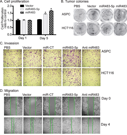 Figure 4: miR483 promotes the formation of tumor colony. A. Cell proliferation. After miR483 transfection, cells were collected for analysis of cell proliferation using the MTT assay. * p<0.01 as compared with the vector control cells. B. Tumor colonies as measured by the Metri-gel assay. ASPC cell colonies were stained on day 15 and HCT116 cells on day 12. C. Cell invasion. Cells invaded through the collagen-coated membrane of the transwell were stained 16 hrs for ASPC and 24 hrs for HCT116. miR-CT: miRNA random control; Anti-miR483: miR483-5p inhibitor. D. Migration of ASPC cells. Cell migration was measured by scratch assay. Note the increased cell migration in the miR483-5p treated cells and the reduced migration in the miR483-5p inhibitor group.