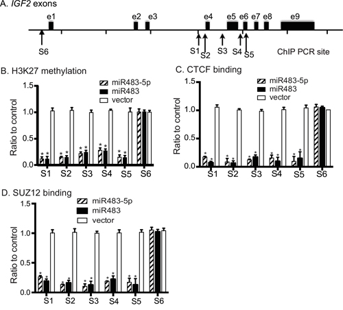 We used quantitative PCR to measure the status of H3K27 methylation at the imprinted promoters (P2-P4)(Sites 1-5) and the non-imprinted promoter P1 (Site 6 as the control). As compared with the vector control group, cells transfected with miR483 and miR483-5p demonstrated a significant decrease in H3K27 methylation at all five sites (S1-S5) around the imprinted IGF2 promoters (p<0.01, Figure 6B). No statistical difference was detected at the non-imprinted promoter P1 (S6).