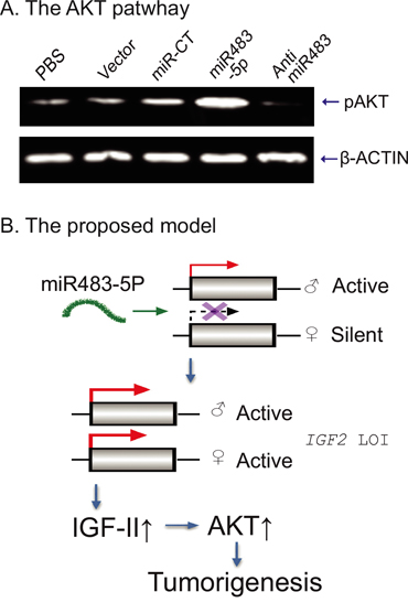 Figure 7: Putative model of the miR483-IGF2-AKT pathway. A. The activated AKT pathway by miR483-5p. The phopho-AKT was detected by Western blot. B. The proposed model of miR483-5p in tumorigenesis. Normally, IGF2 is maternally silenced. miR483-5p binds to the promoter and reactivates the maternal allele, leading to loss of IGF2 imprinting (LOI). The overexpressed IGF-II growth factor induced activation of the AKT pathway in tumorigenesis.
