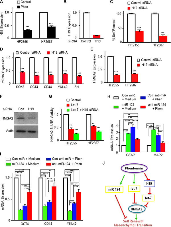 Figure 3: Phenformin regulates the H19/let-7/HMGA2 pathway in GSCs. (A) H19 expression in phenformin (100 μM) treated GSCs was analyzed using qPCR. (B) Silencing of H19 in GSCs (HF2355) using siRNA oligonucleotides. (C) Silencing of H19 in GSCs significantly inhibited GSC self-renewal. (D) The expression of stemness and mesenchymal markers in H19-silenced GSCs (HF2355) was determined using qPCR. (E) HMGA2 expression in H19-silenced GSCs (HF2355 and HF2587) was analyzed using qPCR. (F) Western blot analysis of HMGA2 protein expression in GSCs (HF2355) confirmed that silencing H19 downregulated HMGA2 protein expression. (G) GSCs were transduced with a lentivirus vector expressing a HMGA2 3′-UTR plasmid tagged with luciferase. The cells then were transfected with let-7 or let-7 and H19 siRNA. Let-7 and H19 effects were analyzed by measuring luciferase activity. (H and I) mRNA expression of neuronal, stemness and mesenchymal markers was analyzed in GSCs transduced with lentivirus vectors expressing control, miR-124 or miR-124 antagomiRs with and without phenformin treatment using qPCR. (J) A diagram depicting the molecular mechanisms underlying phenformin effects on GSCs is presented. *p < 0.05; **p < 0.01; ***p < 0.001; and ****p < 0.0001.