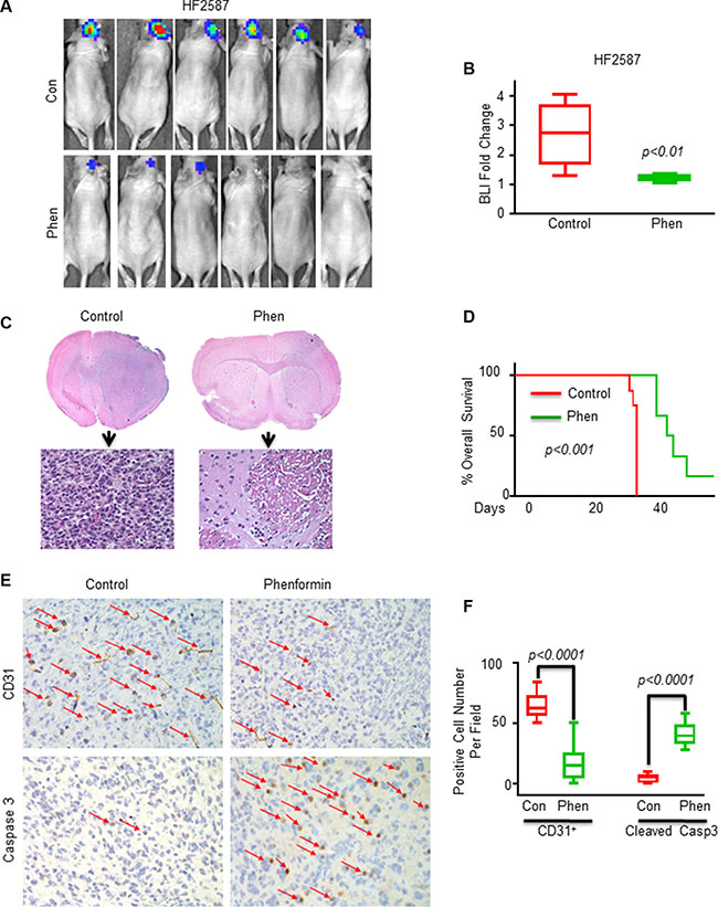Figure 4: Phenformin inhibits tumor growth and angiogenesis, induces apoptosis and increases the overall survival in GSC-derived xenografts. (A) Bioluminescence images (BLI) of control (PBS, n = 6) and phenformin-treated mice (1 mg/ml in drinking water, n = 6) after 4 weeks of phenformin treatment. (B) Average BLI values for the different groups were analyzed. The effect of phenformin on tumor growth was analyzed by measuring changes BLI levels before and after treatments. BLI fold change = photon flux from mice at 8 weeks after implantation of tumors (i.e. 2 weeks after treatment) divided by photon flux of mice at 2 weeks after implantation of tumors. (C) H&E staining of whole brain sections of control and phenformin-treated mice (n = 6). (D) Kaplan-Meier survival curves for mice treated with vehicle (n = 6) or phenformin (n = 6) were determined by both log-rank (Mantel-Cox) test and Gehan-Breslow-Wilcoxon test. (E) IHC staining of tumor sections of control and phenformin-treated mice (n = 6 in each group) was performed for both CD31 and cleaved caspase-3. Red arrows indicate positive cells for the staining of the indicated antibodies. (F) Quantification of CD31 and cleaved caspase-3 positive cells in control and phenformin-treated xenografts.
