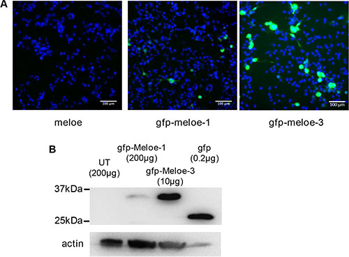 Figure 1: Expression of MELOE-1 and MELOE-3 in melanoma cells. (A) M113 melanoma cells were transfected with meloe-eGFP constructs: the native meloe cDNA (left panel), eGFP-MELOE-1 (middle panel) and eGFP-MELOE-3 (right panel). Analysis of fluorescent cells 48 h post-transfection was made using an automated fluorescence High Content Screening (HCS) microscopic device. Representative images out of 49 scanned fields per condition are shown. Nuclei were Hoescht stained prior to analysis. (B) Fluorescent eGFP-MELOE-1 (lane 2) or eGFP-MELOE-3 (lane 3) proteins were detected by western blot using an anti-eGFP mAb. Untransfected (UT) cells (lane 1) or cells transfected with the peGFP-N3 plasmid (lane 4) were used as controls. Amounts of total proteins loaded in each lane are indicated. A typical experiment is presented out of 4 performed.