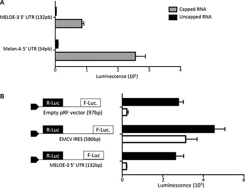 Figure 2: MELOE-3 translation mechanism. (A) In vitro transcribed RNA containing the Melan-A 5′UTR (positive control) or the MELOE-3 5′UTR upstream of Firefly luciferase with or without addition of a 5′MeG were in vitro translated using the Rabbit reticulocyte system. Luminescence is expressed in arbitrary units. (B) pRF bicistronic vectors containing the 5′UTR of MELOE-3, the viral IRES EMCV (positive control) or empty (control plasmid) were transfected into M113 melanoma cell line. Renilla (black bars) and Firefly (white bars) luciferase activities were measured after 48 h and expressed in arbitrary units. Data are expressed as mean ± SD from three different experiments.