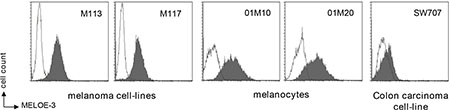 Figure 3: MELOE-3 staining. Melanocytes (01M10, 01M20), melanoma cell lines (M113, M117) and one colon carcinoma cell-line (SW707) were stained with a custom-made MELOE-3 monoclonal antibody (75 μg/mL) and a PE-coupled anti-mouse F(ab’)2 (dark histograms) and analyzed by flow cytometry. A mouse control isotype was used as negative control (clear histograms).