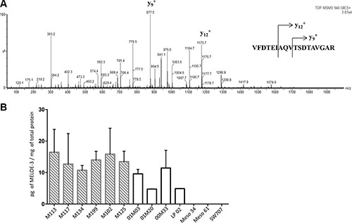 Figure 4: Detection and quantification of MELOE-3 by mass spectrometry. (A) The full length MELOE-3 synthetic peptide was trypsin digested and the VFDTEIAQVTSDTAVGAR (m/z 940.5) sub peptide signature was isolated and fractionated into 29 product ions by tandem mass spectrometry. The major MS/MS transitions 940.5 → 877.7 (y9+; TSDTAVGAR) and 940.5 → 1175.5 (y12+; AQVTSDTAVGAR) transitions were selected as MELOE-3 signatures. (B) Cell lysates from 6 melanoma cell lines (hatched bars) and 4 melanocytes cell lines (white bars) were trypsin digested and MELOE-3 transitions 940.5 → 877.7 and 940.5 → 1175.5 were detected by LC-MS/MS. A standard curve with a range of concentrations of synthetic peptides was used for quantification (see M&M and Supplementary Figure S3). Mesothelioma cell lines (Meso 4, Meso 61) and a colon carcinoma cell line (SW707) were used as negative controls. Data are mean ± SD from 3 distinct experiments.