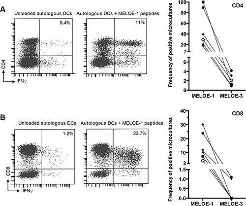 At day 0, PBMCs were plated in 96 well-plates at 2 × 105 cells/wells in RMPI 1640 medium containing 8% human serum, 50 UI/mL IL-2 (Proleukin, Novartis,) and stimulated with 10 μM of overlapping MELOE-1 or MELOE-3 peptides (Supplementary Figure S2) purchased from Proteogenix. DC differentiation and maturation was performed by addition of 1000 U/mL of GM-CSF (CellGenix, Freiburg, Germany) and 500 UI/mL of IL-4 (CellGenix). After 24 hours, TNFα (1000 UI/mL), IL-1ß (10 ng/mL) and prostaglandin E2 (1 μM) (R&D Systems, Minneapolis, USA) were added according to the « accelerated monocyte derived dendritic cells » (acDCs) protocol [15]. After 25 days, PBMCs were re-stimulated with acDCs loaded with overlapping MELOE-1 or MELOE-3 peptides for 5 h in presence of 10 μg/mL Brefeldin A (Sigma). The percentage of microcultures containing specific CD4+ and CD8+ T cells was evaluated by surface staining with anti-CD8 mAb (clone RPA-T8, BioLegend, San Diego, USA) or anti-CD4 mAb (clone RPA-T4, BioLegend) and intracellular staining with an anti-INFγ mAb (clone 45–15, Miltenyi Biotec, Paris, France) after 4% paraformaldehyde fixation and 0.1% saponin permeabilisation.