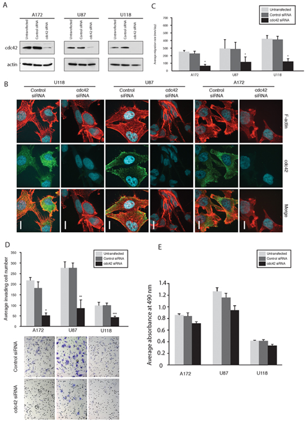Cdc42 knockdown by Cdc42-specific siRNA reduces migration, invasion and alters glioma cell morphology