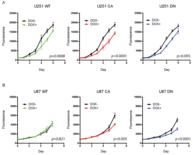 U87 MG and U251 MG Tet-on inducible cell lines were grown in tissue culture plates in DMEM with 10% FBS with or without doxycycline. Three days after treatment, the cells were seeded on 96-well plates at a density of 1000 cells in 100 μl of culture medium containing 10% of FBS with or without doxycycline per well. After 2 hr incubation with 10 μl of Alamar Blue Cell Viability Assay Reagent (Thermo Scientific, Rockford, IN) per well, the number of viable cells was measured using the VERSA max microplate reader (Molecular Devices, Sunnyvale, CA) at 550 and 570 nm wavelength daily for six days after seeding cells.