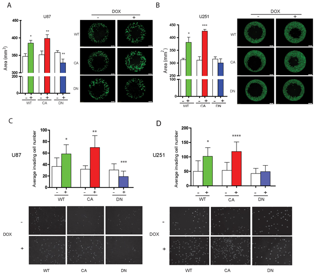 Figure 4: Induced aberrant cdc42 activity alters cell migration and invasion in U87MG and U251MG glioma cells. A, B. Migration assay of Cdc42 expressing inducible U87MG (A) and U251MG (B) cells after 72 hrs of treatment with or without (+ or -) doxycycline. WT- and CA-Cdc42 expressing cell clones significantly increase migration of U87MG and U251MG cells. DN-Cdc42 significantly reduces migration of U87MG cells but does not change migration potential of U251MG cells (p = 0.21). *p < 0.05, **p < 0.01, ***p <0.005. C, D. Matrigel invasion assay of Cdc42 expressing inducible U87MG (C) or U251MG (D) cells after 72 hr of treatment with or without (+ or -) doxycycline. WT- and CA-Cdc42 expressing cell clones treated with doxycycline significantly increase invasion of U87MG and U251MG cells. DN-Cdc42 expression reduces invasion of U87MG cells. DN-Cdc42 expression does not change the invasiveness of U251MG cells however (p = 0.504). *p < 0.01, **p < 0.0001, ***p < 0.05, ****p < 0.0005.