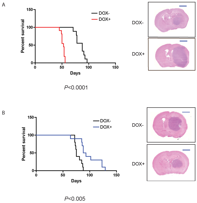 All mouse studies were approved and performed in accordance with the policies and regulations of the Institutional Animal Care Committee of the Hospital for Sick Children, in Toronto. Athymic NOD scid gamma mice (The Jackson Laboratory, Bar Harbor, ME) underwent intracranial (right frontal lobe) implantation of 5×104 tumor cells in 2.5 μl of PBS using a Hamilton syringe on a stereotaxic frame. Before the intracranial injection, cells were treated with or without doxycycline for 3 days. Doxycycline was administered in the animal’s food (Harlan Laboratories, Madison, WI) immediately after surgical implantation of tumor cells. Kaplan-Meier survival curves were established and statistical analyses performed with GraphPad Prism5.