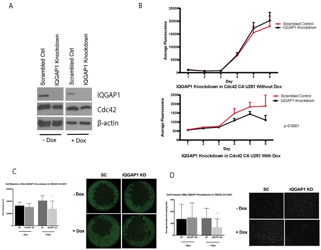 Figure 9: IQGAP1 siRNA on CA-Cdc42 inducible U251MG. A. IQGAP1 knockdown with and without doxycycline. B. Proliferation assay after IQGAP1 knockdown. C. Migration assay after IQGAP1 knockdown *;p<0.05 D. Matrigel invasion assay after IQGAP1 knockdown. *;p<0.05