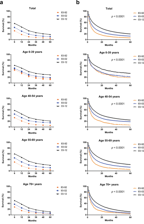 We have identified 63640 HCC cases across three decades from eighteen registry sites with median survival of 4 months, 6 months and 12 months in each decade respectively. Both RSR and survival time improved each decade in patients with HCC in all age groups (Table 1 and Figure 2a). The 6-month RSRs improved from 31.0% to 42.9% to 57.2% each decade, with 27.7% increase in the first two decades and 33.3% in the last two decades. The increasing tendency of survival time was obtained after up to 5 years of follow-up. Similarly Kaplan-Meier survival analysis also confirmed the improvement of survival time in all age groups in three decades (Figure 2b). However the long-term survival seemed gloomy with 5-year RSRs of 4.7%, 10.6% and 18.2% respectively in three decades.