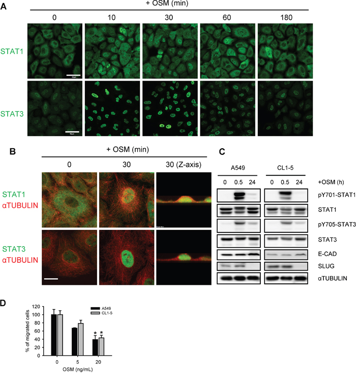 Figure 1: OSM induced the tyrosine phosphorylation and nuclear translocation of STAT1 and STAT3. A, B. A549 cells treated with 20 ng/mL OSM for the indicated durations were subjected to immunofluorescent staining of STAT1, STAT3 (green) and ɑTUBULIN (red), and observed by confocal microscope. Scale bar = 50 μm in (A), 10 μm in (B). C. A549 and CL1-5 cells were subjected to Western blotting analysis after 0.5 and 24 hours of incubation in 20 ng/mL OSM. pY701-STAT1 and pY705-STAT3 indicated the phosphorylated STAT1 and STAT3, respectively. D. A549 and CL1-5 cells were subjected to the migration assay in the presence of 5 or 20 ng/mL OSM. Sterile water was used as control vehicle for non-treated cells. The results are presented as the percentage of migrated cells treated with OSM relative to non-treated control.