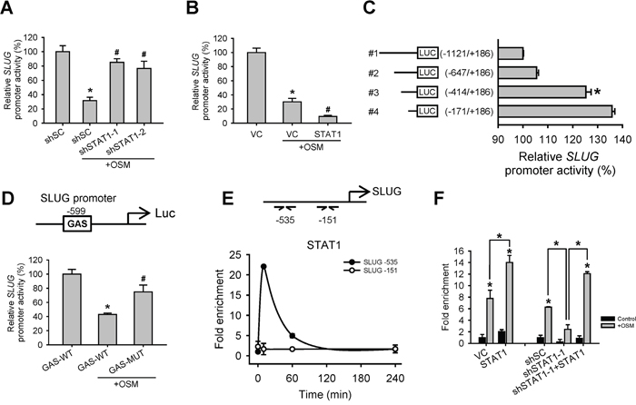 Since SLUG mRNA levels were elevated in shSTAT1 cells and reduced in shSTAT3 cells, we further investigated whether STAT1 decreases SLUG expression through a transcriptional control. We constructed SLUG promoter-driven luciferase expression reporters (SLUG-pro-LUC#1) and test the effect of OSM and STAT1 on SLUG promoter activity. We observed that OSM inhibited SLUG promoter activity, while knockdown of STAT1 reversed the OSM-dependent inhibition resulted in a luciferase activity level similar to control cells (Figure 3A). On the other hand, overexpression of STAT1 augmented the OSM-dependent inhibition of SLUG promoter activity (Figure 3B). To map the potential STAT1 binding site on SLUG promoter region, we constructed luciferase reporter plasmids driven by different lengths of SLUG promoter (SLUG-pro-LUC#1 to 4, Figure 3C), and compared their transcriptional activities in the presence of OSM. We found a significant difference in luciferase activity between SLUG-pro-LUC#2 and SLUG-pro-LUC#3, meaning a potential OSM-dependent regulatory site between -647 and -414 of SLUG promoter, and suggested a potential STAT1 binding site within this region (Figure 3C). In support of this, we speculated a putative STAT1 binding sequence (gamma activated sequence (GAS), TTNNNNNAA) and, in line with our luciferase reporter results, found a potential site mapped at -599 bp upstream of SLUG transcriptional start site (Figure 3D). Moreover, mutagenesis (TTCGCGGAA to GGCGCGGCC) on this GAS sequence in SLUG-pro-LUC#1 released SLUG promoter activity from OSM-mediated suppression (Figure 3D). Nevertheless, through a chromatin immunoprecipitation (ChIP) assay with the anti-STAT1 antibody, we also showed that OSM induced STAT1 binding to SLUG promoter around this region (Figure 3E); the binding level (enrichment) of STAT1 on SLUG promoter was positively correlated with overexpressing or knockdown STAT1 (Figure 3F). These data indicated that OSM inhibited SLUG expression via inducing STAT1 binding to SLUG promoter to suppress its transcription.