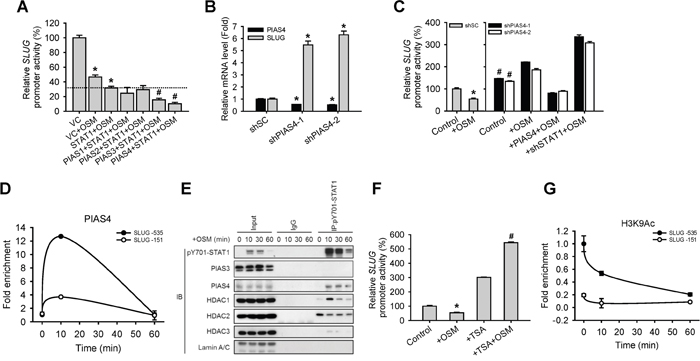 Figure 4: PIAS4 enhances the STAT1-mediated inhibition of SLUG expression. A. A549 cells were co-transfected with vector control (VC) or pcDNA3-STAT1 plasmid, each subtype of PIAS-expressing plasmid and SLUG promoter (-1121 to +186)-driven luciferase-expressing reporter plasmid, and then treated with or without OSM (20 ng/mL). The SLUG promoter activity was analyzed with promoter assay. An asterisk (*) indicated that the difference between the experimental group and VC without OSM are statistically significant; A hash mark (#) indicated the difference between experimental group and STAT1 with OSM are statistically significant B. A549 cells with stable knockdown of PIAS4 (shPIAS4-1 and -2) were subjected to quantitative real-time PCR for analyzing the mRNA expression level of SLUG. C. A549 cells with stable knockdown of scramble shSC, shPIAS4-1 and -2, restoration of PIAS4 in shPIAS4 (+ PIAS4) and double knockdown of PIAS4 and STAT1 (+shSTAT1-1) were co-transfected with SLUG promoter (-1121 to +186)-driven luciferase-expressing reporter plasmid and treated with or without OSM (20 ng/mL). The SLUG promoter activity was analyzed with promoter assay. An asterisk (*) indicated the difference between experimental group and shSC without OSM are statistically significant; A hash mark (#) indicated the difference between experimental group and shSC with OSM are statistically significant. D. A549 cells were treated with OSM (20 ng/mL) and then subjected to the ChIP assay. E. Proteins which interacted with STAT1 were detected by co-immunoprecipitation using nuclear extracts from OSM-treated cells. Lysates were incubated with anti-STAT1 antibody or nonspecific immunoglobulin G (IgG), and bound proteins detected by Western blotting assay. F. A549 cells were co-transfected with SLUG promoter (-1121 to +186)-driven luciferase-expressing reporter plasmid and treated with OSM (20 ng/mL), TSA alone or TSA combined with OSM. The SLUG promoter activity was analyzed with promoter assay. An asterisk (*) indicated the difference between experimental group and Control are statistically significant; A hash mark (#) indicated the difference between experimental group and cells with OSM are statistically significant. G. A549 cells were treated with OSM (20 ng/mL) in 10 and 60 minutes, and then subjected to the ChIP assay to detect H3K9 acetylation on SLUG promoter region.