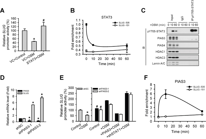 Figure 5: PIAS3 suppressed the STAT3-mediated expression of SLUG. A. A549 cells were co-transfected with vector control (VC) or pcDNA3-STAT3 plasmid and SLUG promoter (-1121 to +186)-driven luciferase-expressing reporter plasmid, and then treated with or without OSM (20 ng/mL). The SLUG promoter activity was analyzed with promoter assay. An asterisk (*) indicated the difference between experimental group and VC control are statistically significant; A hash mark (#) indicated the difference between experimental group and VC with OSM are statistically significant. B. A549 cells were treated with OSM at 10 and 60 minutes and then subjected to the ChIP assay to detect STAT3 on SLUG promoter. C. Proteins which interacted with STAT3 were detected by co-immunoprecipitation using nuclear extracts from OSM-treated cells. Lysates were incubated with anti-STAT3 antibody or nonspecific immunoglobulin G (IgG), and bound proteins detected by Western blotting assay. D. A549 cells with stable knockdown of PIAS3 (shPIAS3-1 and -2) were subjected to qPCR for analyzing the mRNA expression level of SLUG. E. A549 cells with stable knockdown of scramble control (shSC), PIAS3 (shPIAS3-1 and -2), restoration of PIAS3 in shPIAS3 (+ PIAS3) and double knockdown of PIAS3 and STAT1 (+shSTAT1-1) were co-transfected with SLUG promoter (-1121 to +186)-driven luciferase-expressing reporter plasmid and treated with or without OSM (20 ng/mL). The SLUG promoter activity was analyzed with promoter assay. An asterisk (*) indicated the difference between experimental group and shSC without OSM are statistically significant; A hash mark (#) indicated the difference between experimental group and shSC with OSM are statistically significant. F. A549 cells were treated with OSM at the indicated time and then subjected to the ChIP assay to detect PIAS3 on SLUG promoter.