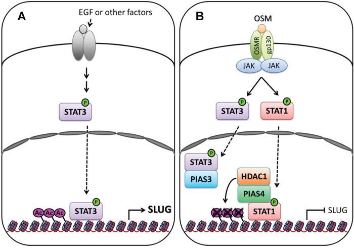 In summary, we showed that both STAT1 and STAT3 were phosphorylated on tyrosine residue of c-terminal of STAT proteins, and translocated to the nucleus after OSM treatment. A knockdown study indicated that STAT1 and STAT3 oppositely regulated SLUG expression at its transcription level, as well as cell morphology and motility. Using reporter assay, co-immunoprecipitation (co-IP), and chromatin immunoprecipitation (ChIP) assays, we showed that PIAS4 and PIAS3 respectively bind to STAT1 and STAT3, leading to enhanced STAT1 binding to SLUG promoter and alleviating STAT3 from SLUG promoter, causing an epigenetic change and silenced SLUG promoter.