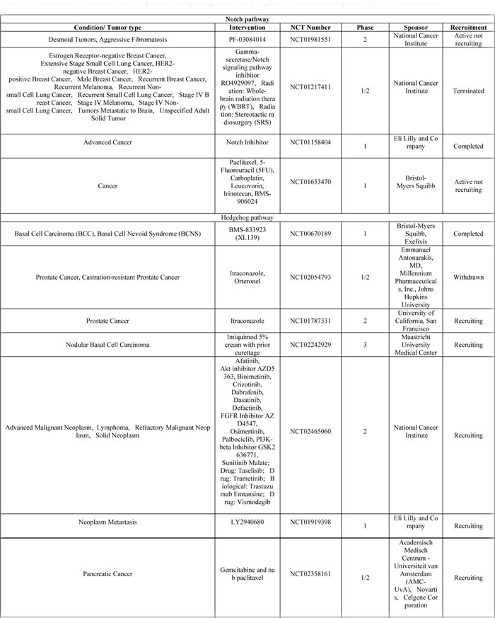 Notch pathway has immense importance in terms of cell fate determination, angiogenesis, CSC and tumor immunity. Notch signaling is predominantly involved in cell-cell communication between adjacent cells through transmembrane receptors and ligands [109, 110]. This interaction of ligand on one cell with transmembrane receptor on adjoining cell initiates a two-step cleavage of the receptor; the initial proteolytic cleavage is carried out by enzymes, disintegrins and metalloproteinases (ADAM 10 or ADAM 17) also known as tumor necrosis factor-α converting enzyme (TACE). Subsequent cleavage is carried out by γ-secretase causing an intracellular fragment to detach that interacts with nuclear factors causing expression of target gene. Notch is an intricate pathway comprising of five notch ligands (Delta-like ligand 1 [DLL1], DLL3, DLL4, Jagged1 and Jagged2) and four notch receptors (Notch1, Notch2, Notch3, and Notch4), regulating a complex array of different factors. The expression of Notch receptors and ligands varies in different tumors and tumor subtypes. Moreover, post-translational modifications of Notch receptors alter their half-life and affinity towards ligands [111, 112]. On the other hand, delineated noncanonical Notch pathways are also gaining importance in cancer progression [113-117]. The diversity of Notch signaling pathway is clinically significant as targeting Notch pathway affects a heterogeneous group of cells within a tumor that includes CSC, vascular endothelial cells and immune cells. Apart from this, as discussed below under New Drug Discovery Research, understanding the role of Notch pathway in the context of tumor progression and metastasis is important in identifying new & novel targets for drug development.